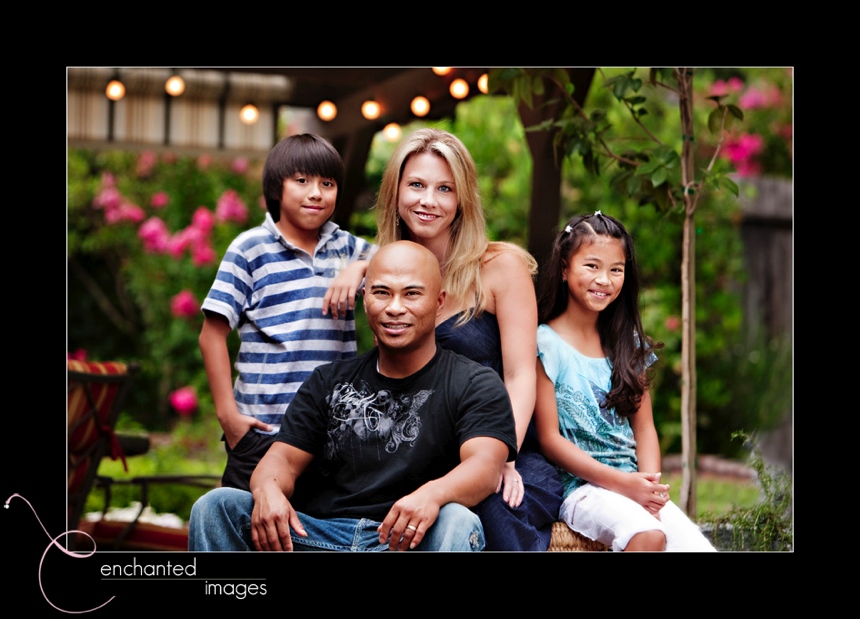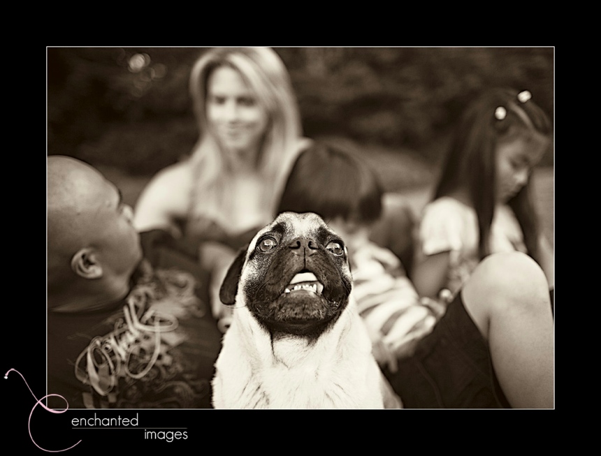 We photographed the Corpuz family at their lovely Roseville home on a July day, when one would expect it to be bright and sunny, but we were in for a little surprise! We hardly saw rain at all this past year, and low and behold, it started to rain right in the middle of summer! Luckily it was only a little bit, and we took cover under their patio for a few minutes to keep from getting damp. That is when this gorgeous family portrait was made….thanks to the sprinkles! They really wanted their family dog, Mr. Cookie, to be in all of the family shots, but he had his own agenda. We did get a few of him, though, and they loved this black & white of him in particular (I think it was the kids’ favorite!).